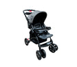 Este coche de la marca Bebesitos integra un sistema de amortiguación reforzado en sus ruedas delanteras que garantiza un desplazamiento suave y estable en diversas superficies urbanas. Su estructura robusta de color gris cuenta con una bandeja frontal desmontable que incluye porta vasos doble, permitiendo tener a la mano bebidas o alimentos mientras el bebé descansa en un asiento acolchado con múltiples niveles de inclinación.